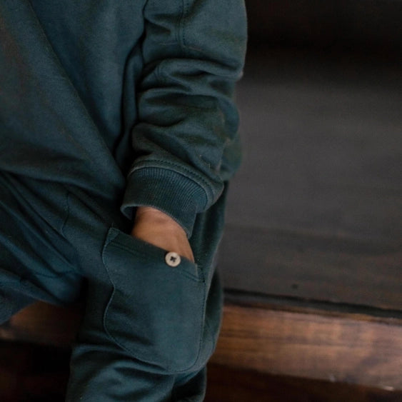 Sweatshirt and jogger set is 100% organic cotton and has elastic at leg openings, functional pockets, and a functional drawstring on the pants.